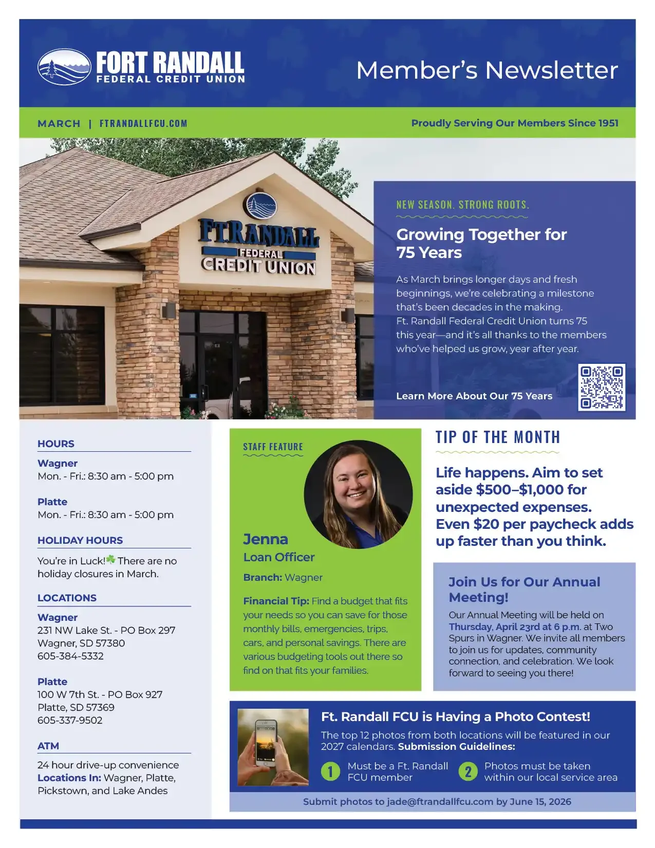 March at Fort Randall Federal Credit Union celebrates 75 years of serving our members and communities. This month, get to know Jenna in our staff spotlight, share your favorite moments by entering the member photo contest (submissions due by June), and mark your calendar for the Annual Meeting in Wagner. FRFCU continues to prioritize trusted service and meaningful connections for all members.