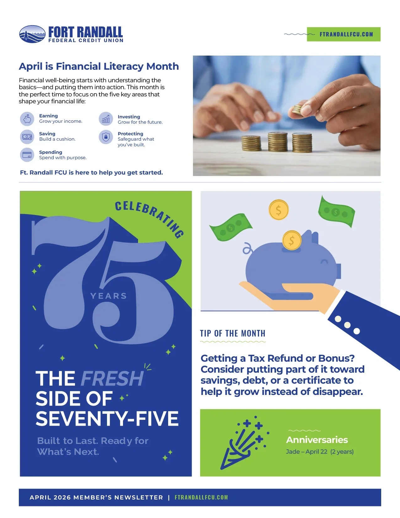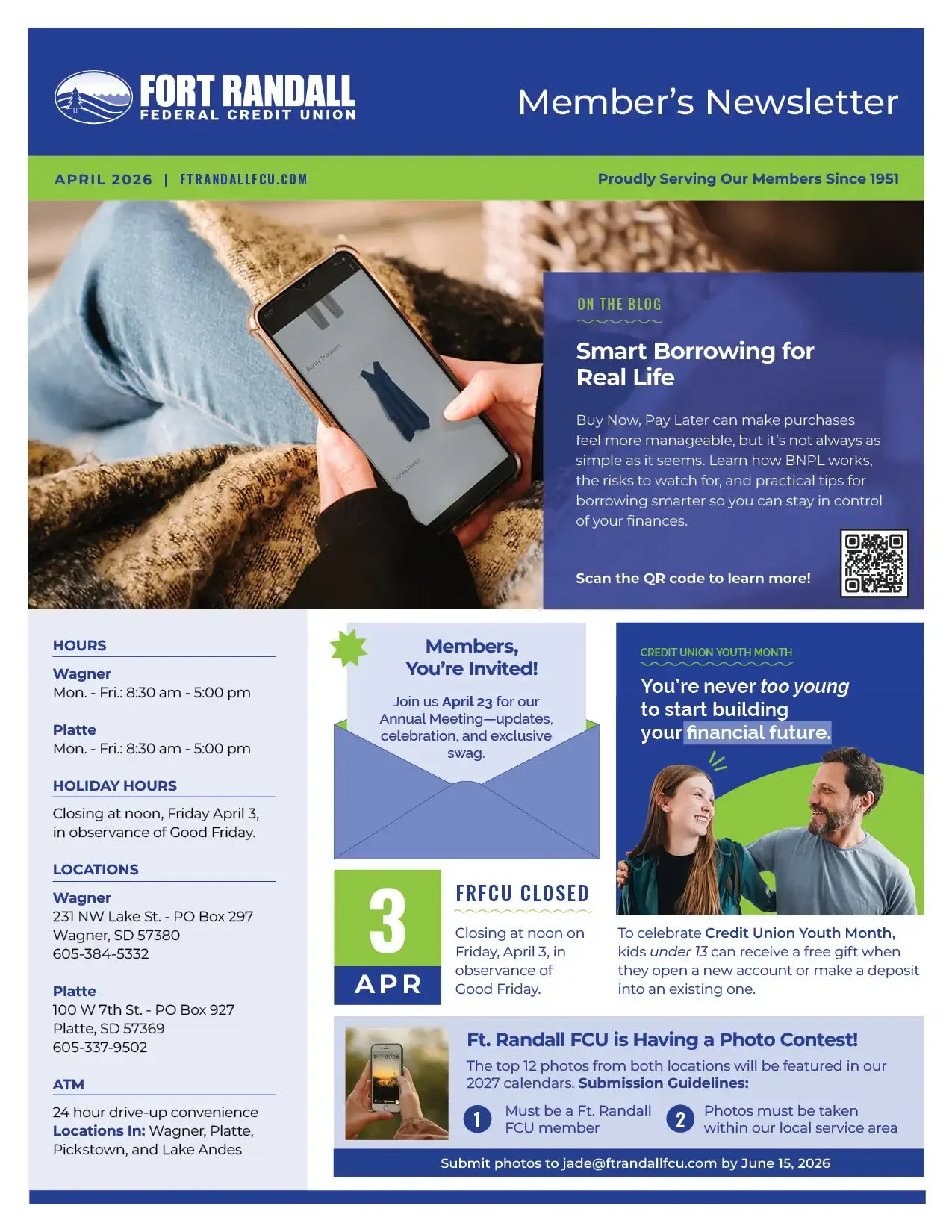 The April 2026 Fort Randall FCU Member Newsletter is packed with tips and updates to help you take charge of your finances. Learn smart borrowing strategies, celebrate Credit Union Youth Month, get inspired by our 75th anniversary, and discover practical ways to save, invest, and protect your money. Plus, don’t miss the Annual Meeting on April 23 and our photo contest for a chance to be featured in the 2027 calendar—there’s something for every member this month!